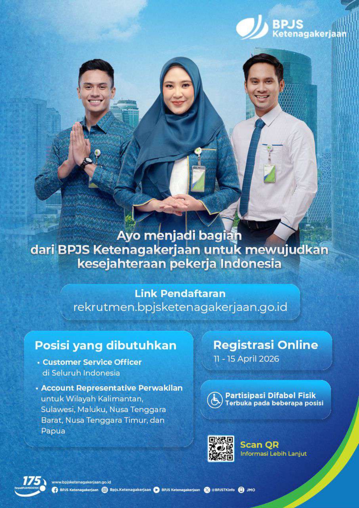 Dalam rekrutmen kali ini, BPJS Ketenagakerjaan juga membuka kesempatan bagi penyandang disabilitas fisik untuk berpartisipasi pada beberapa posisi yang tersedia.