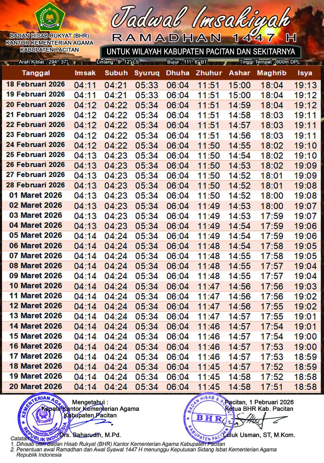 Berikut daftar lengkap Jadwal Imsakiyah Ramadan 1447 H untuk wilayah Kabupaten Pacitan dan sekitarnya berdasarkan rilis BHR Kemenag Pacitan.