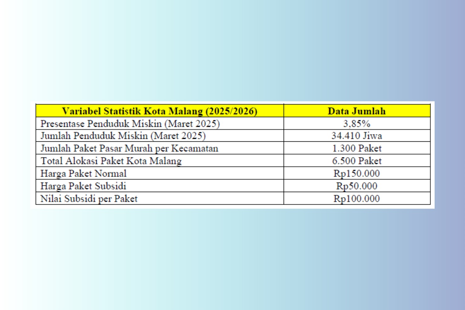 Jika angka ini dikalikan dengan lima kecamatan, total paket yang tersedia hanyalah 6.500 unit. Namun, apabila data ini disandingkan dengan statistik kemiskinan resmi dari Badan Pusat Statistik (BPS) Kota Malang, tampak jelas bahwa kuota tersebut hanyalah "setetes air di tengah padang pasir" yang tidak akan pernah mampu meredam gejolak permintaan masyarakat.