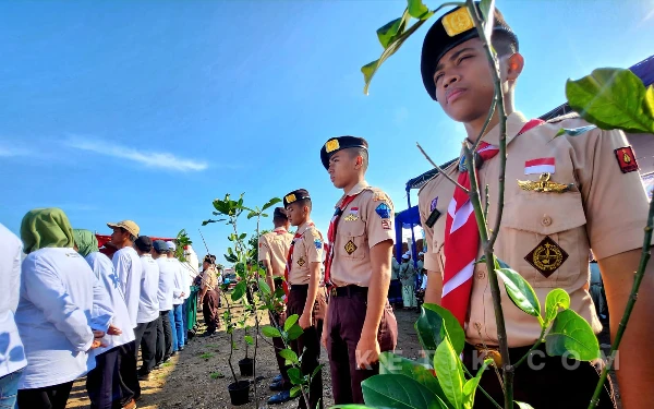 Sejumlah anggota Pramuka di sela apel bersih-bersih Pantai Tambak Wedi sebagai upaya perwujudan Program Nasional Indonesia ASRI di kawasan kaki Jembatan Suramadu Surabaya, Jumat, 6 November 2026. (Foto: Fiqih Arfani/ketik.com)