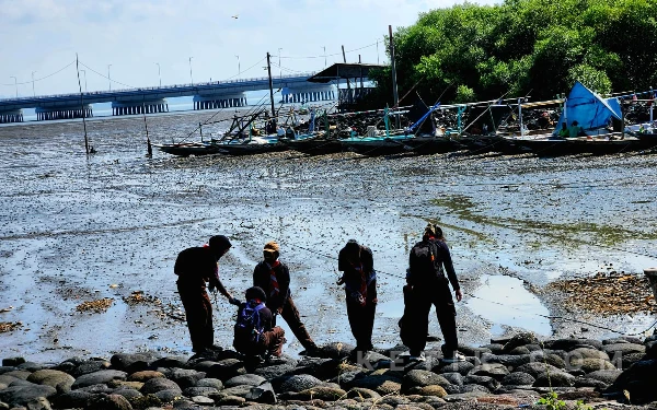 Sejumlah anggota Pramuka Jatim membersihkan Pantai Tambak Wedi sebagai upaya perwujudan Program Nasional Indonesia ASRI di kawasan kaki Jembatan Suramadu Surabaya, Jumat, 6 November 2026. (Foto: Fiqih Arfani/ketik.com)
