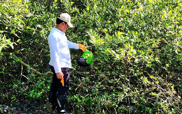 Kepala Dinas Lingkungan Hidup Provinsi Jawa Timur Nurkholis melakukan bersih-bersih Pantai Tambak Wedi sebagai upaya perwujudan Program Nasional Indonesia ASRI di kawasan kaki Jembatan Suramadu Surabaya, Jumat, 6 November 2026. (Foto: Fiqih Arfani/ketik.com)