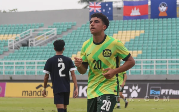 Selebrasi Georgio Hassarati, pemain Australia U-17 usai mencetak gol ke gawang Brunei Darussalam. (Foto: Fitra/Ketik.com)
