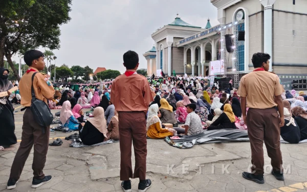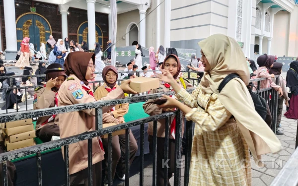 Anggota Pramuka dengan ramah memberikan kotak takjil untuk jemaah yang hadir di Masjid Al Akbar, Surabaya. (Foto: Fitra/Ketik.com)