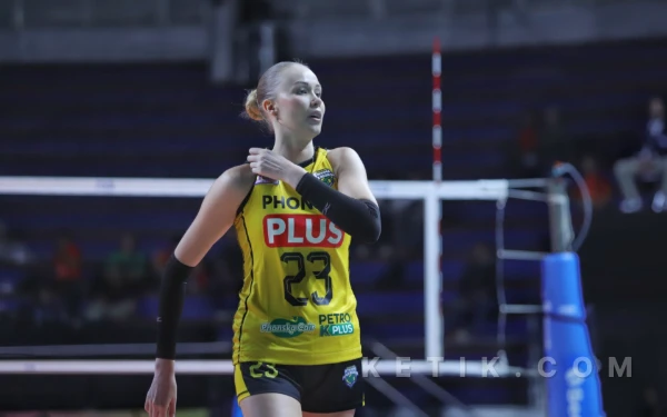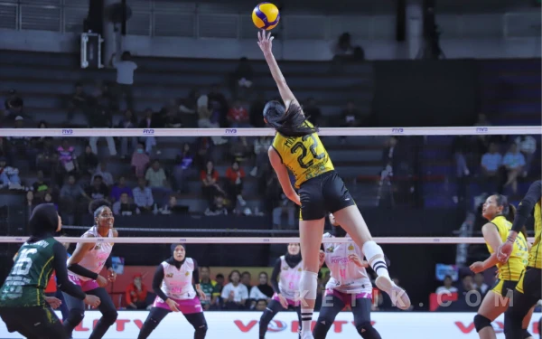 Annie Mitchem melepaskan smash pada saat pertandingan Final Four Proliga 2026, mempertemukan Petrokimia vs Popsivo Polwan. (Foto: Fitra/Ketik.com)