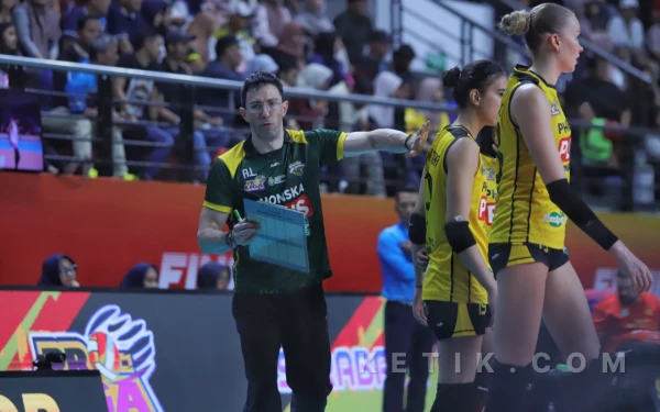 Tatapan kosong pelatih Jakarta Popsivo Polwan Darko Dobreskov saat timnya tertinggal dari Gresik Petrokimia. (Foto: Fitra/Ketik.com)