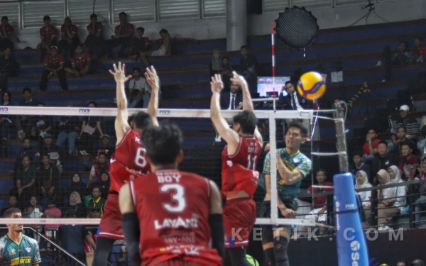 Pemain Samator gagal mendapatkan poin usai diblok pemain Lavani. Bola mengalir keluar lapangan. (Foto: Fitra/Ketik.com)