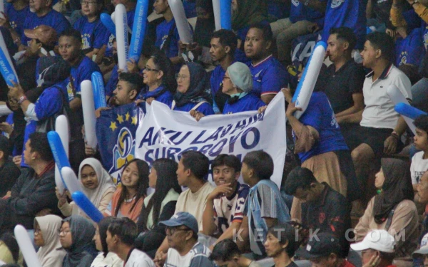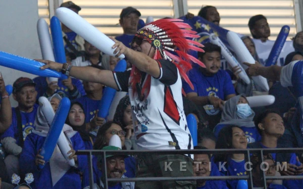 Aksi nyentrik pendukung Lavani di Jawa Pos Arena, Minggu 5 April 2026. (Foto: Fitra/Ketik.com)