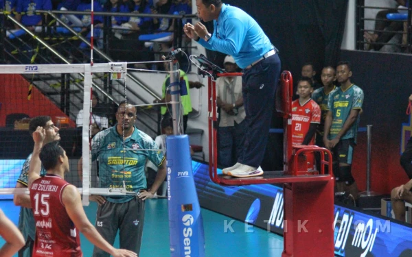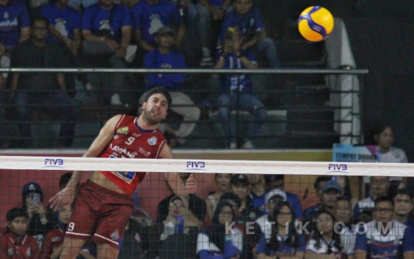 Pemain Lavani Nato Dickinson memberikan servis mematikan yang tidak berhasil diantisipasi Samator. (Foto: Fitra/Ketik.com)