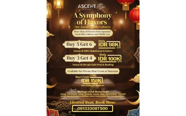 Ascent Hotel & Cafe Malang menghadirkan paket berbuka bertajuk "A Symphony of Flavors" yang berlokasi di 100% Bakehouse & Eatery di harga Rp98.009/pax, Gin-Gin Cafe Pool & Rooftop dengan harga Rp100.000/pax dengan promo Buy 5 Get 6, Buy 3 Get 4, serta Private Iftar Event di Manzana (min. 25 pax). (Foto: Ascent Hospitality Group for Ketik.com)