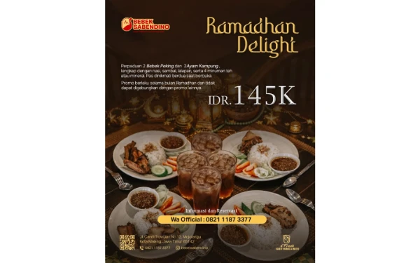 Bebek Sabendino yang berada di D'Fresh Guesthouse Malang menghadirkan 2 paket iftar, paket 4 minuman di harga Rp145.000/paket dan paket 2 minuman di harga Rp75.000/paket. (Ascent Hospitality Group for Ketik.com)