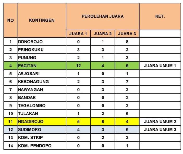 Berdasarkan rekapitulasi medali, Ranting Pacitan keluar sebagai Juara Umum I dengan perolehan 12 medali emas, empat perak, dan enam perunggu.