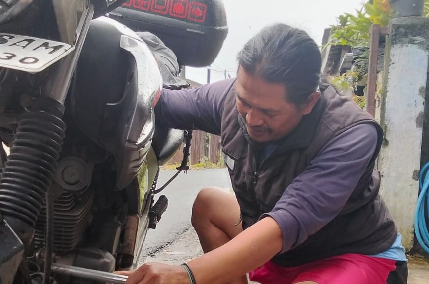 Jajang kala sedang memeriksa motor yang baru diservis sebelum diserahkan ke pemiliknya. (Foto: Dendy Ganda/Ketik.com)