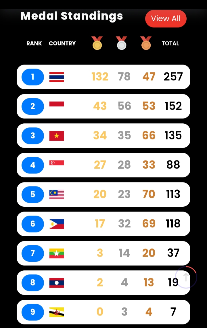 Sementara tuan rumah Thailand yang berada di peringkat pertama mengoleksi total 257 medali. Rinciannya 132 medali emas, 78 perak dan 47 perunggu.