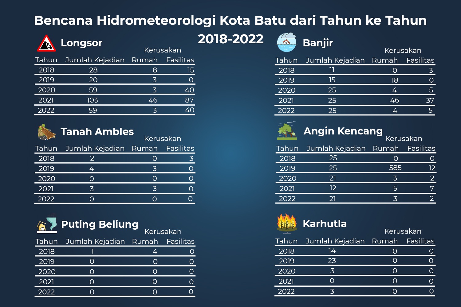 Data-data ini menunjukkan bahwa Kota Batu merupakan salah satu contoh daerah yang mengalami bencana hidrometeorologi. Dengan kondisi geografis perbukitan, alih fungsi lahan, serta peningkatan curah hujan, Kota Batu perlu memperkuat mitigasi bencana, terutama di sektor drainase, dan penguatan tebing.