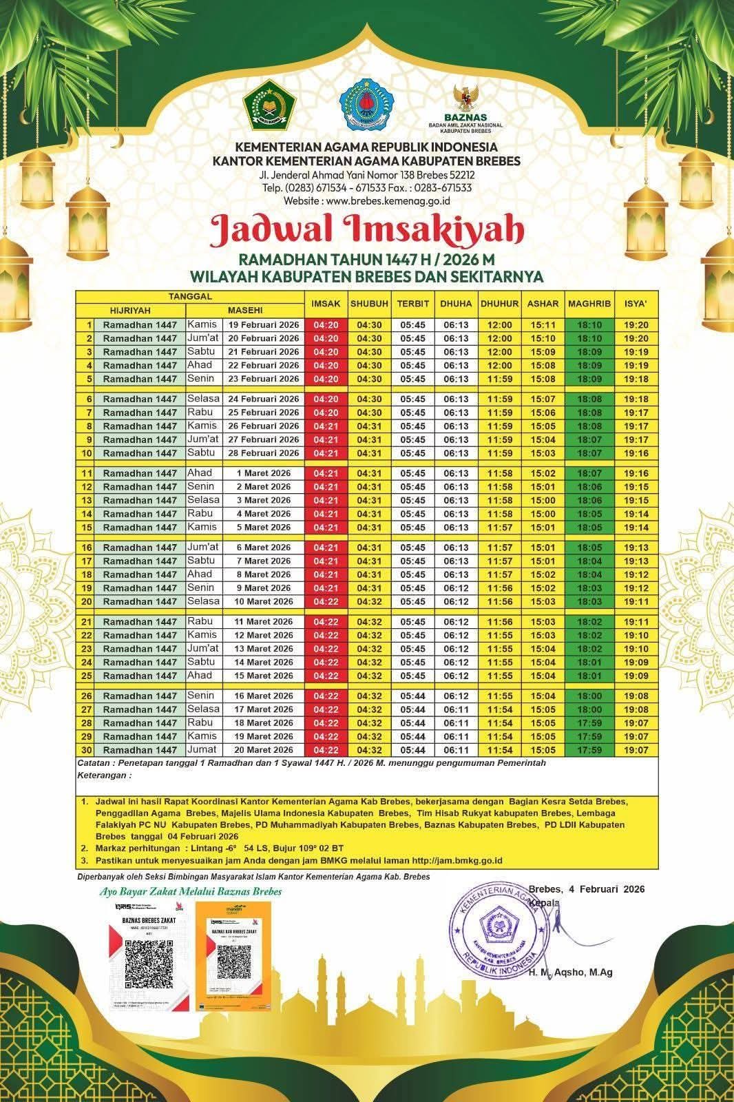 Kantor Kementerian Agama Kabupaten Brebes resmi menerbitkan Jadwal Imsakiyah tertanggal Selasa, 4 Februari 2026.