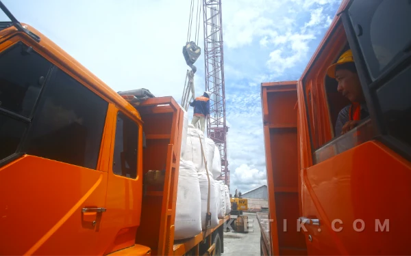 Terlihat para pekerja melakukan aktivitas bongkar muat pupuk kemasan (bag cargo) jenis Muriate of Potash (MOP) sebanyak 4.509 ton di Dermaga PTP Non Petikemas Cabang Palembang di Pelabuhan Boom Baru, Rabu 15 April 2026. Pelabuhan Boom Baru memiliki panjang dermaga hingga 507 meter serta memiliki luas lapangan