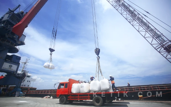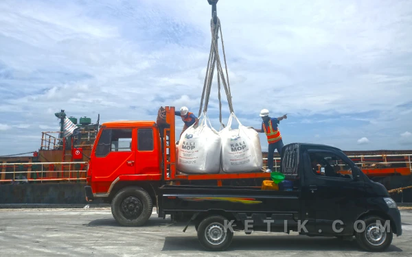 Terlihat para pekerja melakukan aktivitas bongkar muat pupuk kemasan (bag cargo) jenis Muriate of Potash (MOP) sebanyak 4.509 ton di Dermaga PTP Non Petikemas Cabang Palembang di Pelabuhan Boom Baru, Rabu 15 April 2026. Pelabuhan Boom Baru memiliki panjang dermaga hingga 507 meter dan memiliki luas lapangan berkapasitas 21.855 M2. Selain pelabuhan boom baru, PTP Nonpetikemas Cabang Palembang memiliki Pelabuhan Sungai Lais yang luasnya kurang lebih 200 hektar. Wahyu Rahmanto/ketik.com