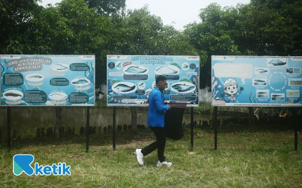 Siswa Universitas PGRI Palembang Fakultas Perikanan dan Kelautan melintas di papan keterangan jenis dan status konservasi ikan belida di Indonesia yang ada di Pusat Riset dan Konservasi Ikan Belida di Kampus C Universitas PGRI Palembang Jalan. Sakti Wiratama RT 8 RW 2 Kelurahan Srimulya, Kecamatan. Sematang Borang, Palembang, Sumatera Selatan, Sabtu 18 Oktober 2025. (Foto:Wahyu Rahmanto/ketik.com)