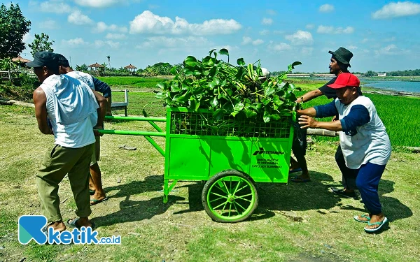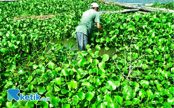 Seorang anggota Kelompok Masyarakat (Pokmas) Ngudi Tirto Lestari, mengambil gulma eceng gondok di Waduk Cengklik, Kabupaten Boyolali, Jawa Tengah, Ahad, 8 September 2024. Pokmas mitra binaan Program CSR/TJSL PT. Pertamina Patra Niaga Regional Jawa Bagian Tengah (JBT) Aviation Fuel Terminal (AFT) DPPU Adi Sumarmo ini memiliki concern kegiatan mengolah eceng gondok menjadi biogas. Salah satu pemanfaatan biogasnya untuk menyalakan lampu penerangan jalan di Dukuh Turibang, Desa Sobokerto, Kecamatan Ngemplak, Kabupaten Boyolali. (Foto: Achmad Fazeri/Ketik.co.id)