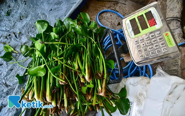 Potret eceng gondok yang sudah dibersikan dari tanah beserta akarnya, kemudian ditimbang. Setelah mencapai 15 kilogram, eceng gondok tersebut dicacah kembali untuk kedua kalinya dengan menggunakan mesin pencacah. Cacahan kedua eceng gondok inilah yang kemudian dimanfaatkan sebagai salah satu bahan pembuatan biogas oleh Pokmas Ngudi Tirto Lestari. (Foto: Achmad Fazeri/Ketik.co.id)