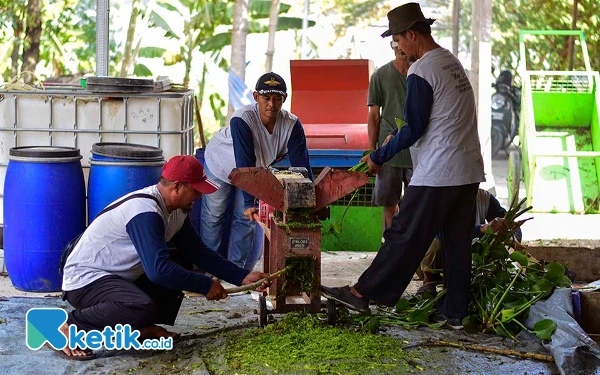 Anggota Pokmas Ngudi Tirto Lestari melakukan proses pencacahan eceng gondok yang sudah bersih dari tanah serta akarnya menggunakan mesin pencacah. Eceng gondok yang sudah dicacah tersebut dicampur cairan molase, lalu dimasukkan ke dalam bak penampungan (biodigester) kurang lebih selama 21 hari supaya terjadi proses fermentasi hingga menghasilkan biogas. (Foto: Achmad Fazeri/Ketik.co.id)