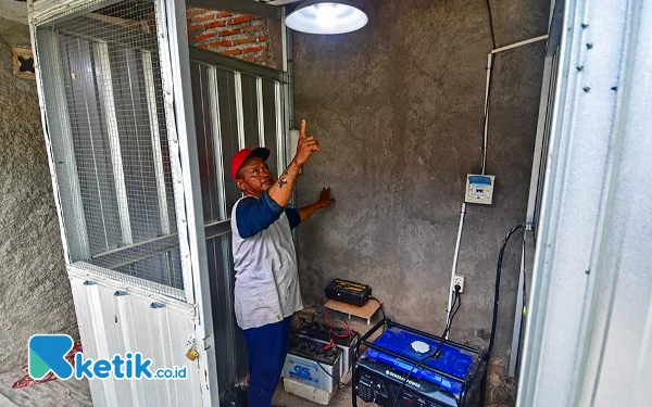 Dalmanto, anggota Pokmas Ngudi Tirto Lestari, menunjuk ke sebuah lampu yang dinyalakan dengan menggunakan genset berbahan bakar biogas hasil olahan dari gulma eceng gondok Waduk Cengklik, Kabupaten Boyolali. Ada sekitar 12 lampu jalan Dukuh Turibang, Desa Sobokerto, Kecamatan Ngemplak, Kabupaten Boyolali yang sumber energi listriknya berasal dari olahan gulma eceng gondok tersebut. Selain sebagai cahaya penerangan jalan, biogas itu juga dimanfaatkan 19 Kepala Keluarga (KK) untuk memasak. Adapun limbah olahan biogasnya dibuat menjadi pupuk organik baik berupa cair maupun padat. (Foto: Achmad Fazeri/Ketik.co.id)