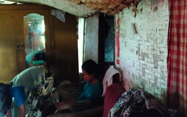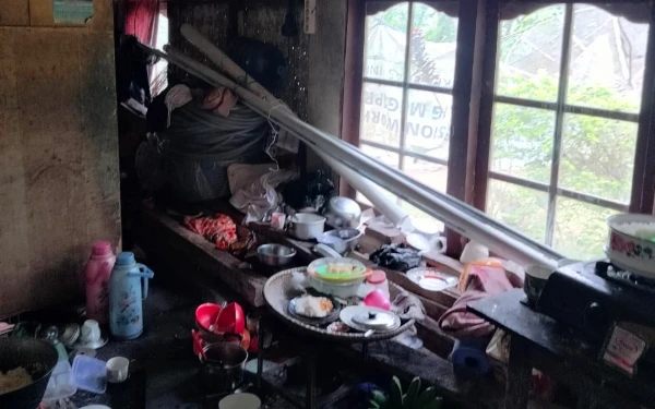 Rumah yang ia tempati selama bertahun-tahun sudah tidak layak huni, terlihat rapuh dengan dinding yang mulai lapuk dan atap rumah yang hampir jatuh. Ibu Sopiah juga tinggal dengan satu anak perempuannya dan dua cucunya (26/12/2024) (Foto: Ade for Ketik.co.id)
