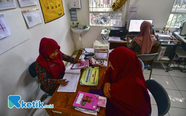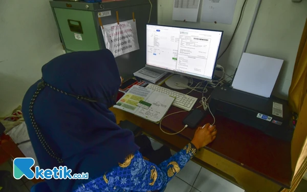 Petugas membuat surat rujukan lewat online untuk persalinan Caesar bagi pasien ibu hamil peserta BPJS Kesehatan di Puskesmas Wirosari 1, Kabupaten Grobogan, Jawa Tengah, Rabu (17/7/2024). Surat rujukan bisa didapat di Fasilitas Kesehatan Tingkat Pertama (Faskes I), baik itu puskesmas atau klinik tempat pasien terdaftar. (Foto: ketik.co.id/Achmad Fazeri)