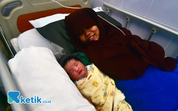 Seorang pasien peserta BPJS Kesehatan tersenyum melihat putrinya yang baru ia lahirkan melalui persalinan Caesar di RS Permata Bunda Purwodadi, Kabupaten Grobogan, Jawa Tengah, Sabtu (27/7/2024). BPJS Kesehatan akan mencover biaya perawatan pasca melahirkan atau PNC sesuai standar dalam 2 kali kunjungan, dan layanan tindakan pasca persalinan di puskesmas yang memiliki Pelayanan Obstetri Neonatal Eemergensi Dasar (PONED). (Foto: ketik.co.id/Achmad Fazeri)
