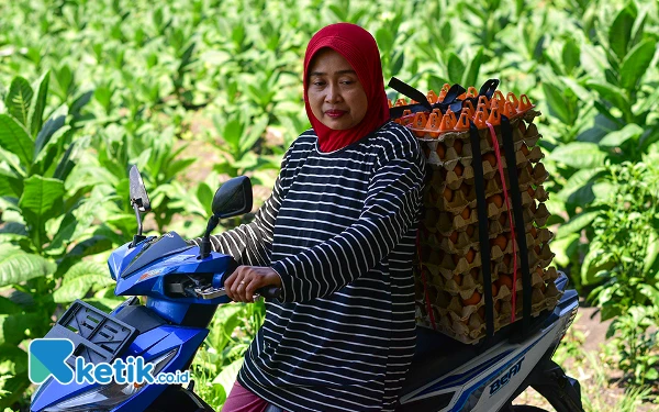 Seorang pekerja, Yanti hendak mengantarkan telur ayam ke toko maupun warung sembako di Kabupaten Bojonegoro, Jawa Timur, Minggu, 29 September 2024. Hingga akhir tahun 2023, total daya tersambung program EA PLN sebesar 3.647 Mega Volt Ampere (MVA) atau tumbuh sekitar 16 persen dari 2022 sebesar 3.128 MVA. (Foto: Achmad Fazeri/Ketik.co.id)