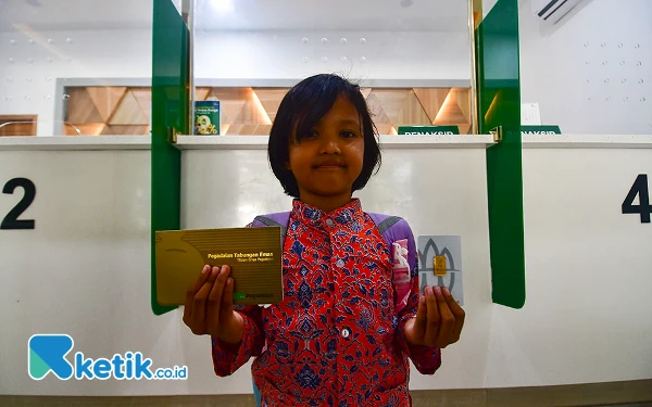 Seorang murid TK Bustanul Athfal Wirosari, Haniyya (6 tahun), menunjukkan logam mulia dari hasil tabungan emas di Pegadaian UPC Wirosari, Kabupaten Grobogan, Jawa Tengah, Kamis, 19 September 2024. Tahun 2015, PT Pegadaian (Persero) merilis salah satu produk investasi emas bernama “Tabungan Emas”, dimana hingga tahun 2024 ini telah berhasil mengumpulkan pembelian emas seberat 21 ton. (Foto: Achmad Fazeri/Ketik.co.id)