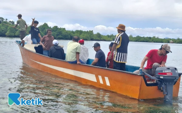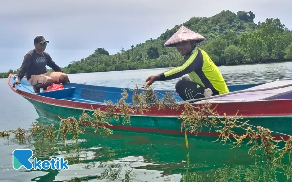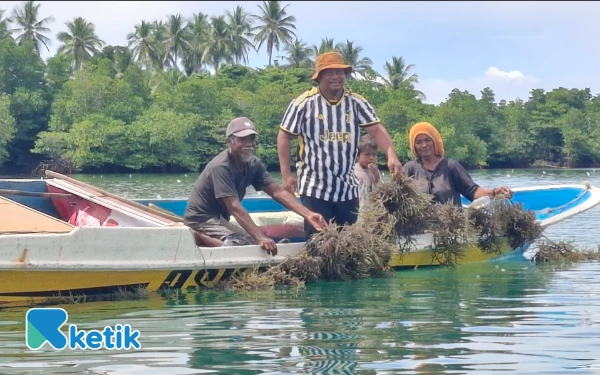 Kepala Desa Laluin Viki Slamat dan warga Desa Nelayan rumput laut melakukan aktivitas perawatan rumput laut Sabtu, 12 Juli 2025 (Foto: Mursal/Ketik.com)