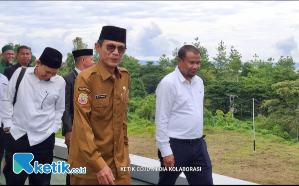 Wabup Halmahera Selatan Helmi Umar Muchsin dan Kepala Dinas Perkim Ikbal Hi. Mustafa tersenyum saat saat mininjau kesiapan Masjid Agung Alkhairaat yang akan Di gunakan Salat Idul Fitri. (Foto:Mursal Bahtiar/Ketik.co.id) (Minggu 24 Maret 2025)