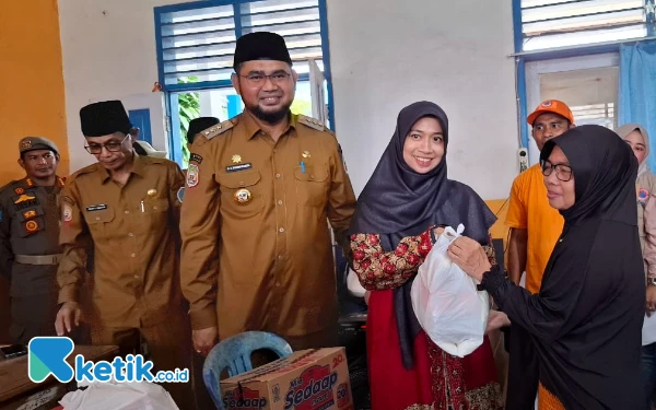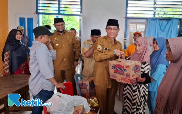 Wakil Bupati Halmahera Selatan Helmi Umar Muchsin menyerahkan bantuan kepada salah satu warga korban Banjir. Wabup Helmi turut prihatin atas banjir yang menimpa warga. (Foto:Mursal Bahtiar/Ketik.co.id) (Senin 24 Maret 2025)