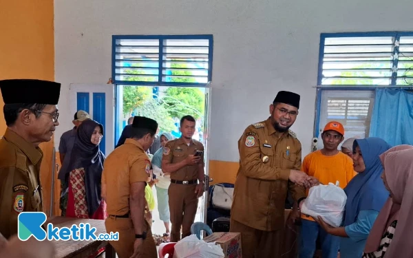 Kepala BPBD Halmahera Selatan Aswin Adam Saat menyerahkan Bantuan Paket Sembako kepada warga Korban Banjir kecamatan Bacan (Foto:Mursal Bahtiar/Ketik.co.id) (Senin 24 Maret 2025)