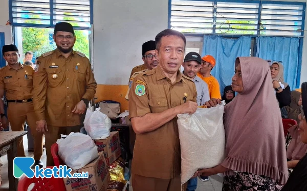 Kepala Dinas Sosial Halmahera Selatan Sofyan Tomadehe tampak tersenyum dapat memberikan bantuan kepada korban banjir. (Foto:Mursal Bahtiar/Ketik.co.id) (Senin 24 Maret 2025)