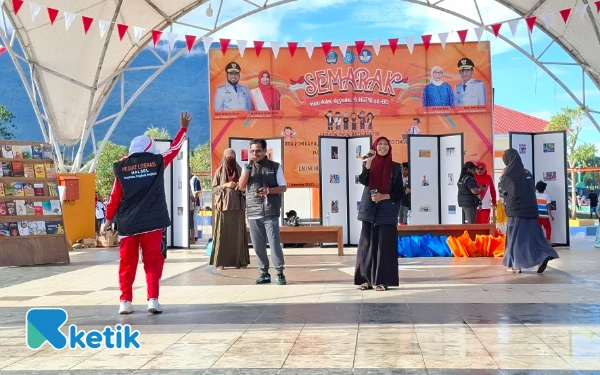Para penggiat literasi di Car Free Day memilih jalan unik: mengemas ilmu lewat kuis berhadiah. Anak-anak pun antusias, bukan semata karena hadiah, tapi karena tawa yang menyertai. Satirnya, buku baru dilirik bila disandingkan dengan doorprize. Namun justru di situlah benih literasi tumbuh—pelan, sederhana, tapi menjanjikan arah. (Foto: Mursal/Ketik)