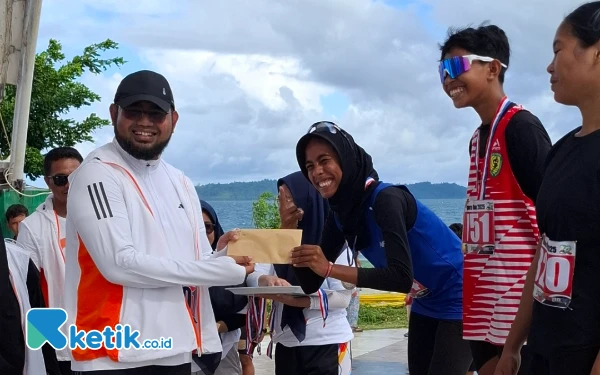 Bupati Bassam Kasuba menyarahakan bonus kepada juara lari 10 kilo puteri Minggu, 8 Juni 2025 (Foto: Mursal/Ketik.co.id)