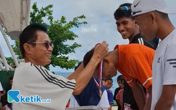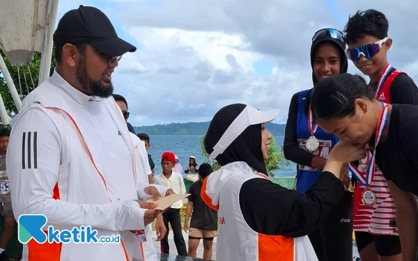 Wakil Bupati Halmahera Selatan Helmi Umar Muchsin mengalungi medali dan memberi bonus ke juara lari 5 kilo meter putera Minggu, 8 Juni 2025. (Foto: Mursal/Ketik.co.id)