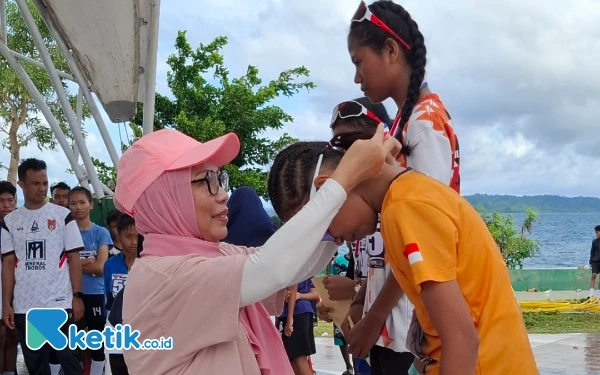Ketua GOW Halsel Mardiana Helmi mengalungi medali ke juara lomba lari 5 kilo meter serta menyerahkan bonus hadiah Minggu 8 Juni 2025 (Foto: Mursal/Ketik.co.id)