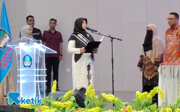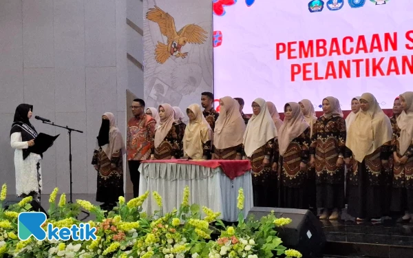 Bunda Paud Kabupaten Halmahera Selatan Rifa’at Al-Sa’adah Bassam membacakan ikrar pelantikan di Aula Kantor Bupati Sabtu, 23 Agustus 2025 (Foto: Mursal/Ketik)