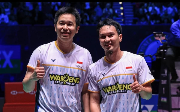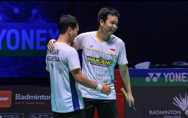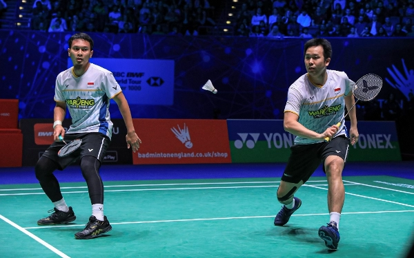 Pasangan ganda putra Indonesia Mohammad Ahsan dan Hendra Setiawan melaju ke final ajang bulu tangkis tertua di dunia All England 2023. (Foto-foto:Humas PP PBSI)