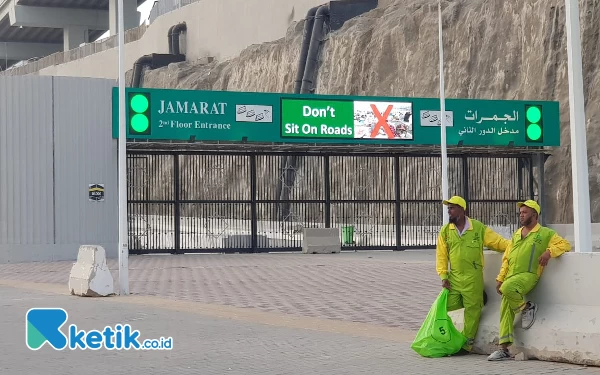 Petugas kebersihan standby untuk mengantisipasi adanya rombongan tour jemaah saat melihat tempat lempar jumroh. (Foto: Muhsin Budiono/Ketik.co.id)