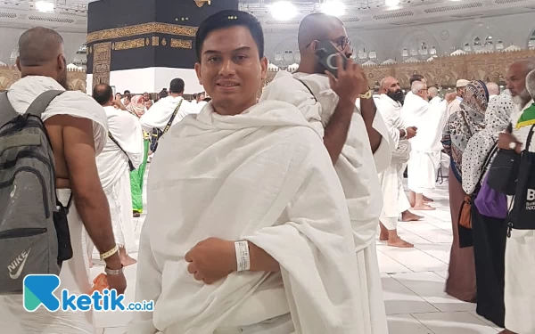 Jurnalis Ketik.co.id Muhsin Budiono mengenakan baju ihram dengan latar belakang Ka'bah.