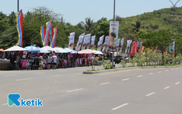 Depan pintu masuk utama Sirkuit Mandalika mulai dipadati para pedagang kaos dan pernak-pernik balap, 2 Oktober 2025. (Foto: Rahmat Rifadin/Ketik)