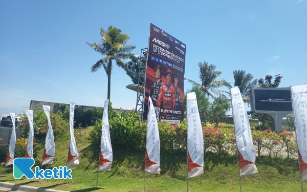 Baliho MotoGP menghalangi pandangan para pengunjung saat masuk melalui pintu utama di depan Sirkuit Mandalika, 3-5 Oktober 2025. (Foto: Rahmat Rifadin/Ketik)