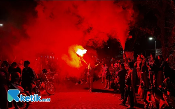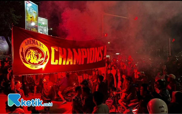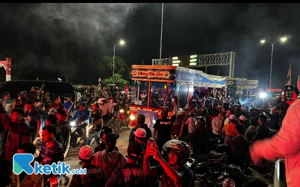 Aremania merayakan juara sekaligus menyambut kedatangan tim Arema FC. (Foto : Kiagus Firdaus/Ketik.co.id)