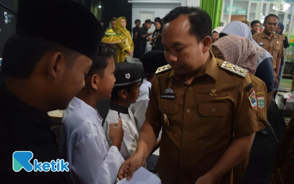 Bupati Bondowoso Abdul Hamid Wahid menyampaikan pidato di acara puncak Anniversary ke-3 Ketik.com di Graha Ketik, Kota Malang, 9 September 2025. (Foto: Dok. Ketik)