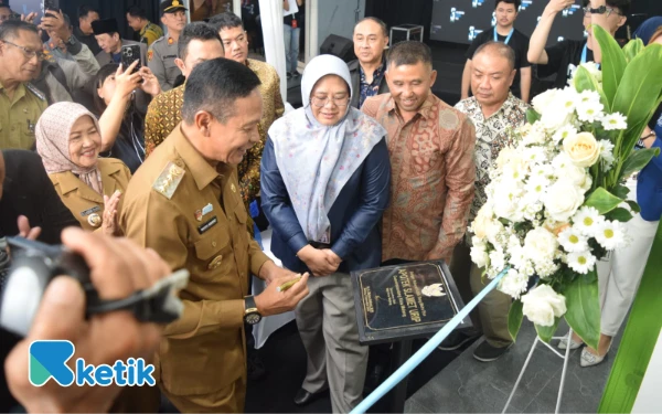 Wali Kota Malang Wahyu Hidayat, Bupati Bondowoso Abdul Hamid Wahid, Wakil Wali Kota Malang Ali Muthohirin, Wakil Bupati Malang Lathifah Shohib, Kadiskominfo Jatim Sherlita Ratna Dewi Agustin, Kadis Peternakan Jatim Indyah Aryani, CEO Ketik.com Kiagus Firdaus dan para tamu undangan di acara puncak Anniversary ke-3 Ketik.com di Graha Ketik, Kota Malang, 9 September 2025. (Foto: Dok. Ketik)